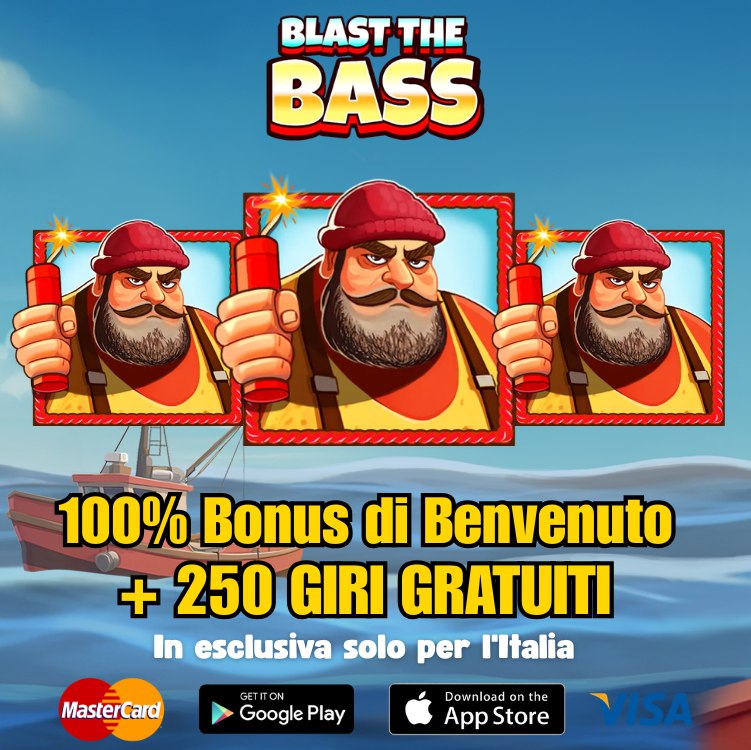 Рекламная картинка игрового автомата Blast the Bass с морской тематикой. В центре расположен золотой круглый символ с рыбой и множителем 250X. По бокам находятся два одинаковых изображения персонажа-рыбака в красной шапке с динамитом в руках. Фон выполнен в синих тонах, имитирующих водную среду.