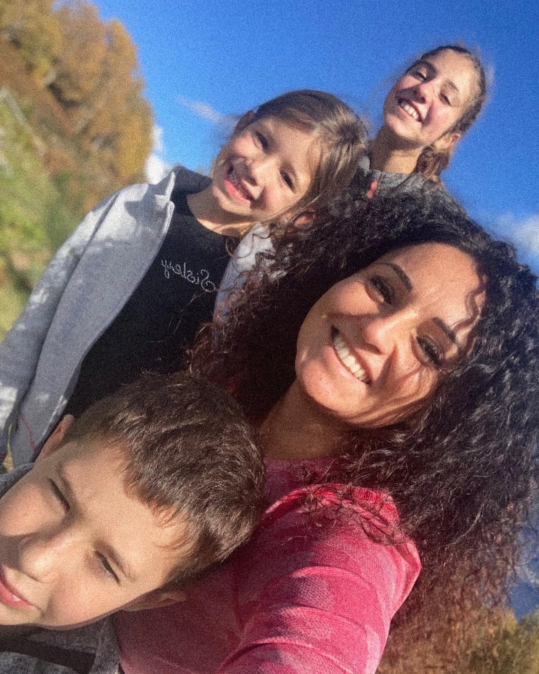 Селфи-фотография группы людей на фоне голубого неба и осенних деревьев. В кадре четыре человека: женщина в розовой кофте на переднем плане, мужчина слева внизу, девушка в черной одежде сверху слева и еще одна девушка справа. Все улыбаются, создается впечатление дружеской встречи или семейного фото.