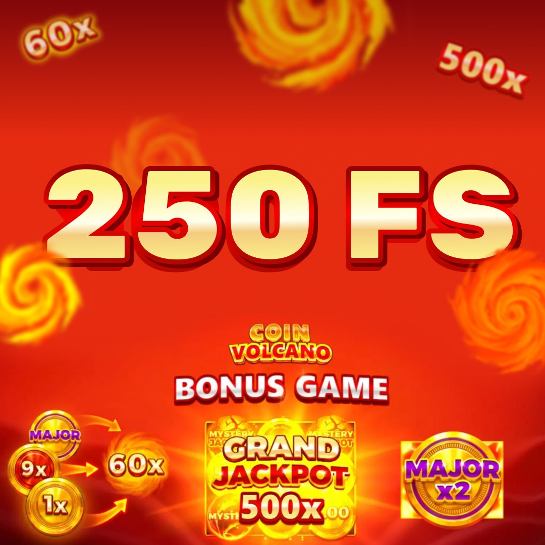 Статичное рекламное изображение слота Coin Volcano с огненно-красным фоном и закручивающимися огненными вихрями. В центре крупно отображается '250 FS' (250 фриспинов). Показаны элементы бонусной игры с множителями от 1x до 500x, включая иконку 'MAJOR x2' и 'GRAND JACKPOT 500x'. В углах видны множите