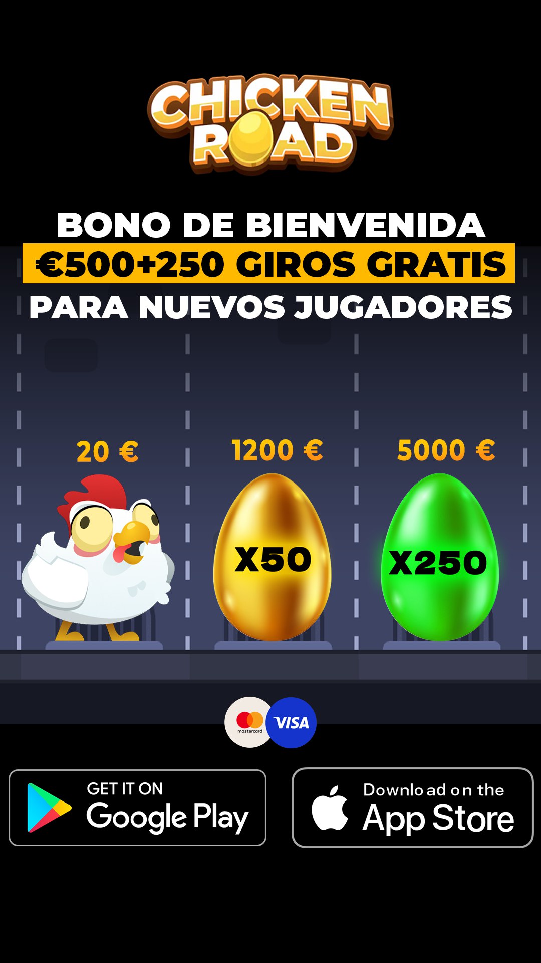Статичное рекламное изображение для мобильной игры Chicken Road. Показан логотип игры с яйцом, крупный заголовок о бонусе и три колонки с разными суммами депозитов и соответствующими количествами бесплатных вращений. Внизу логотипы платежных систем и кнопки скачивания из App Store и Google Play.