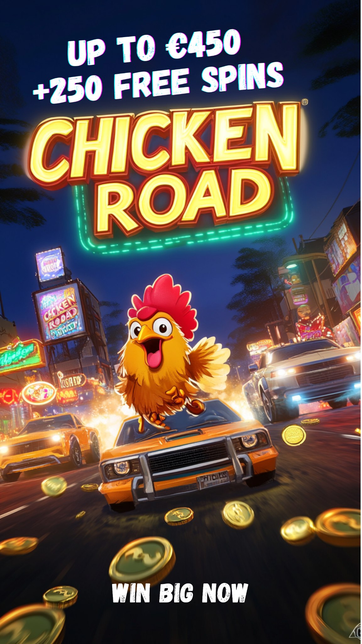 Статичное изображение рекламы слота Chicken Road с мультяшным цыпленком на крыше оранжевого автомобиля на ночной городской улице. Вокруг летают золотые монеты, на заднем плане неоновые вывески казино. Крупная неоновая вывеска 'CHICKEN ROAD' доминирует в верхней части изображения.