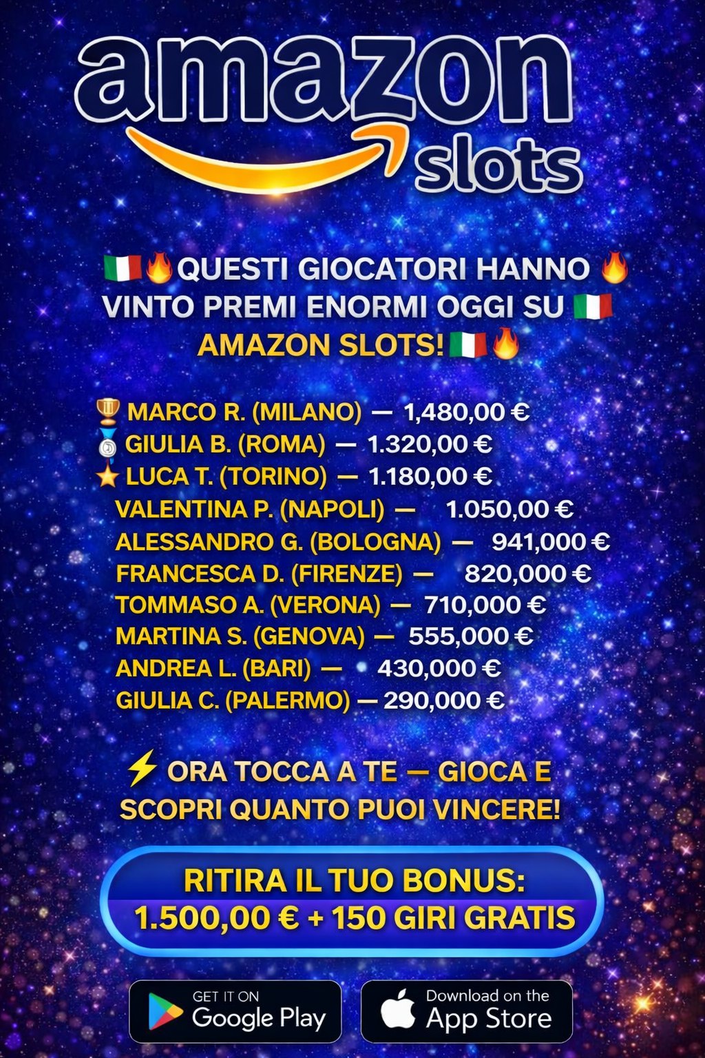 Статичное изображение в стиле Amazon Slots на космическом фоне. Показан список победителей с крупными выигрышами из разных итальянских городов. В центре - призыв к игре и информация о бонусе для новых игроков.
