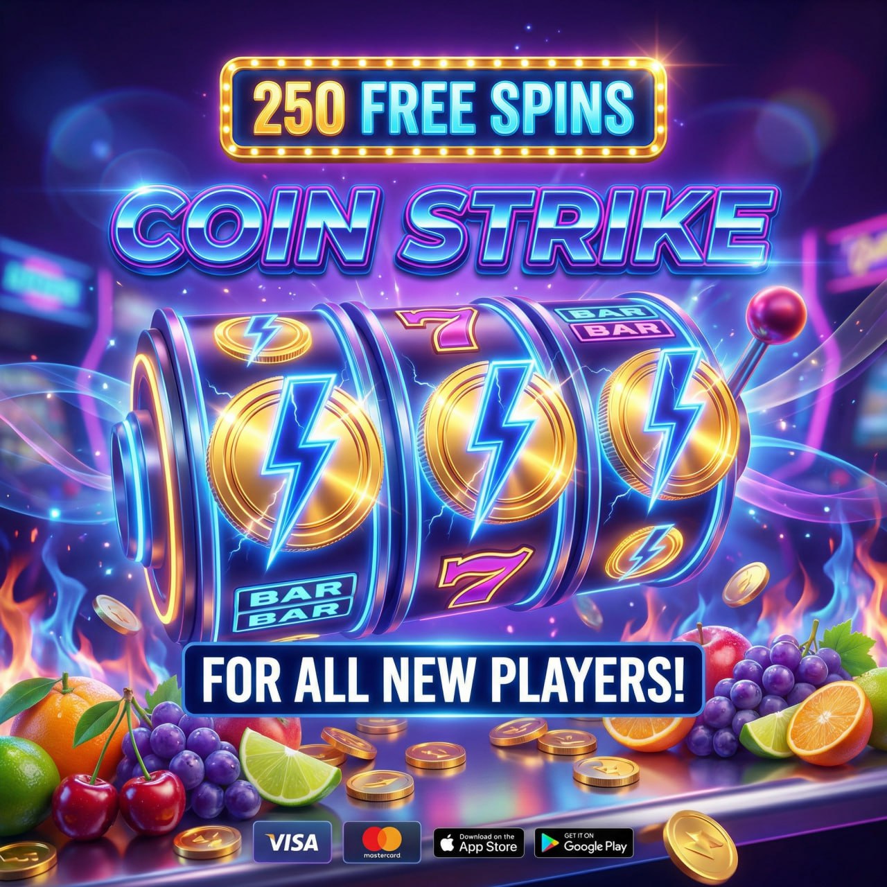 Рекламное изображение слота Coin Strike с предложением 250 бесплатных вращений для новых игроков. В центре композиции находятся три барабана слота с символами молний на золотых монетах, красными семёрками и символом BAR. Вокруг барабанов летают золотые монеты и размещены фрукты (виноград, апельсины,