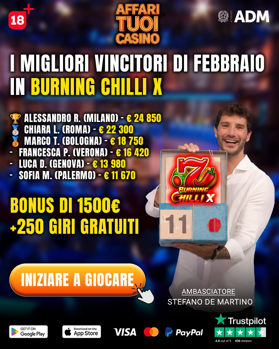 Рекламное изображение для мобильного казино с элементами итальянского ТВ-шоу Affari Tuoi. В центре мужчина в белой рубашке (посол Stefano De Martino) держит синий куб с числом 11 и логотипом слота Burning Chilli X. Показан список лучших победителей февраля с их выигрышами от €11,670 до €24,850. Вниз