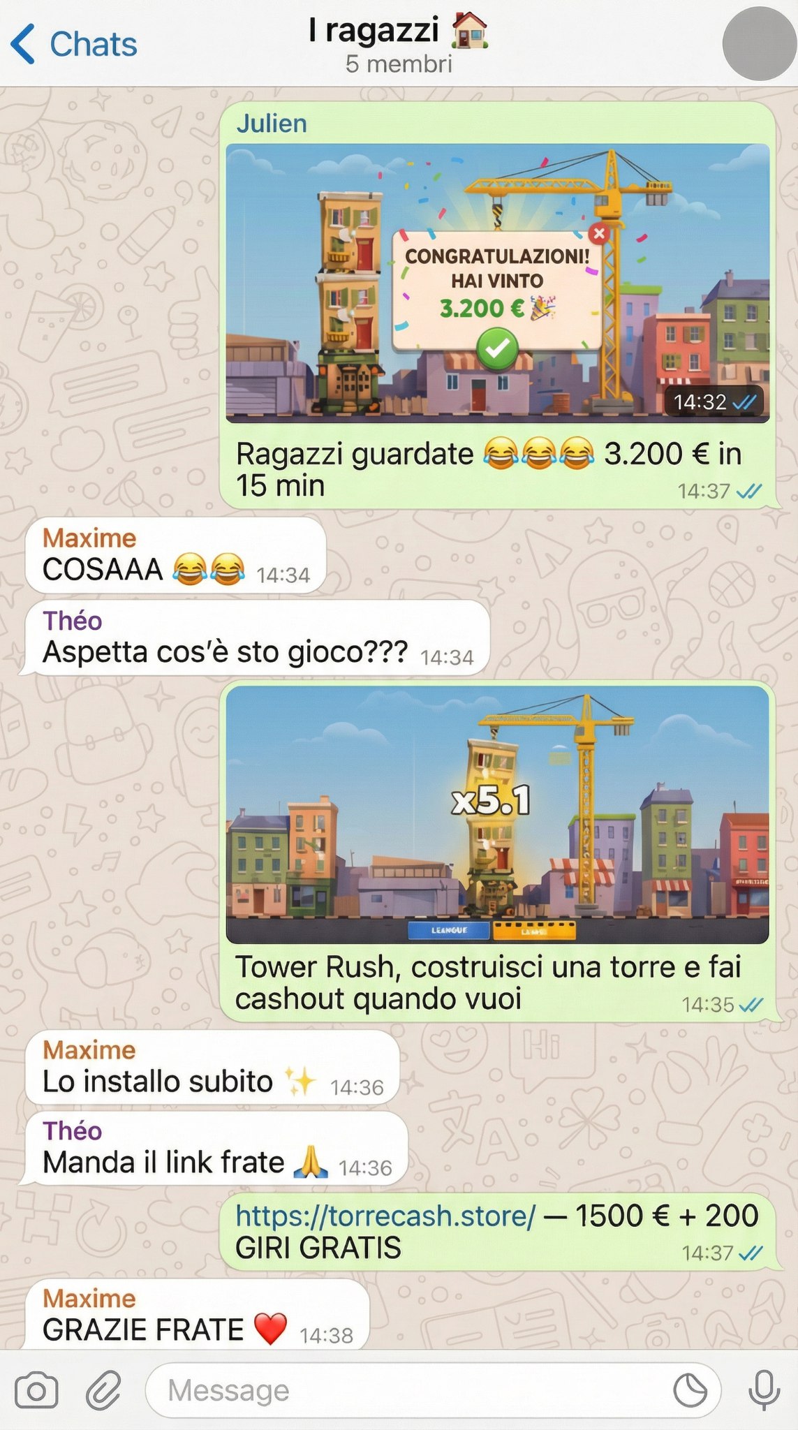 WhatsApp Tower Rush fake_chat социальное_доказательство выигрыш бонус итальянский скетч