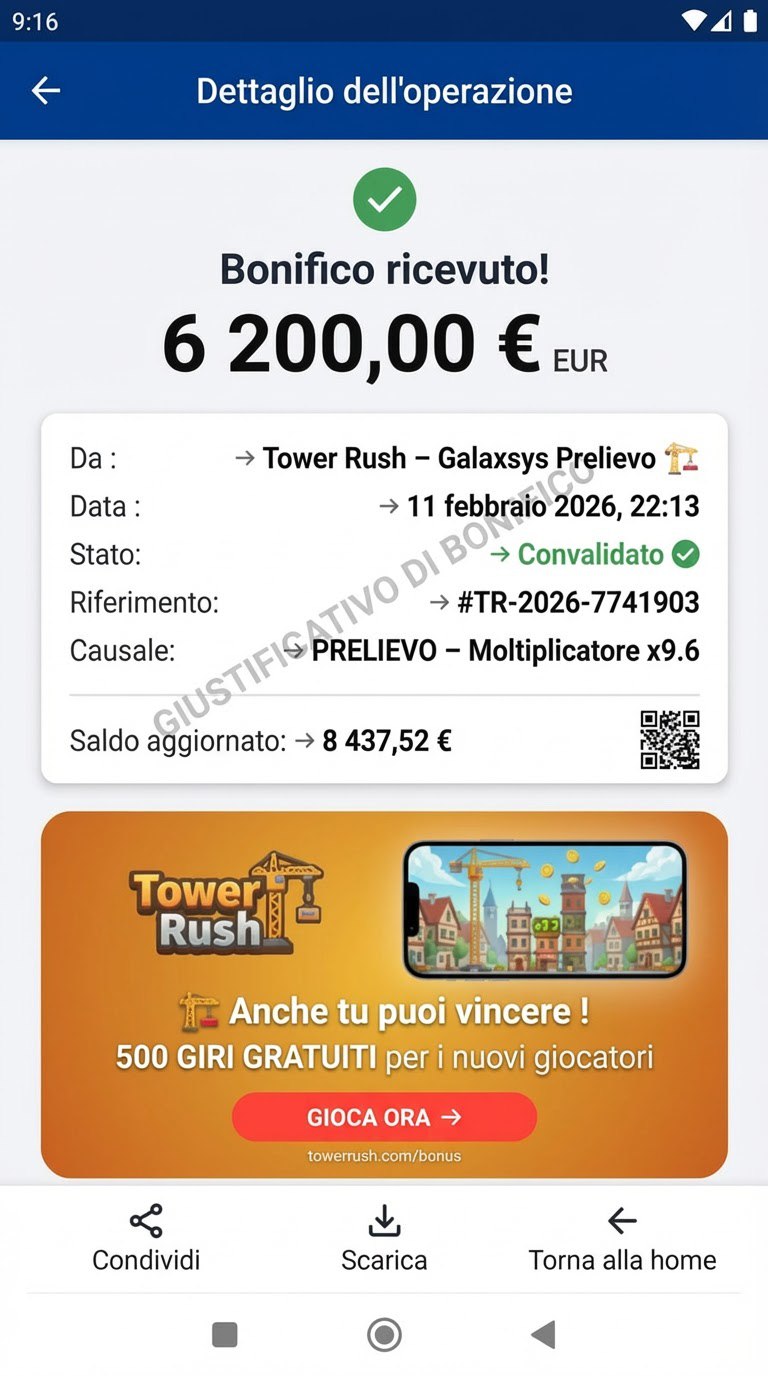 Статическое изображение экрана подтверждения выигрыша в мобильном приложении. Показан экран с зеленой галочкой и сообщением о получении бонуса 6200 евро. Детали операции включают игру Tower Rush - Galaxsys Prelievo, дату 11 февраля 2026, статус 'Convalidato' (подтвержден), и баланс 8437,52 евро. Вни
