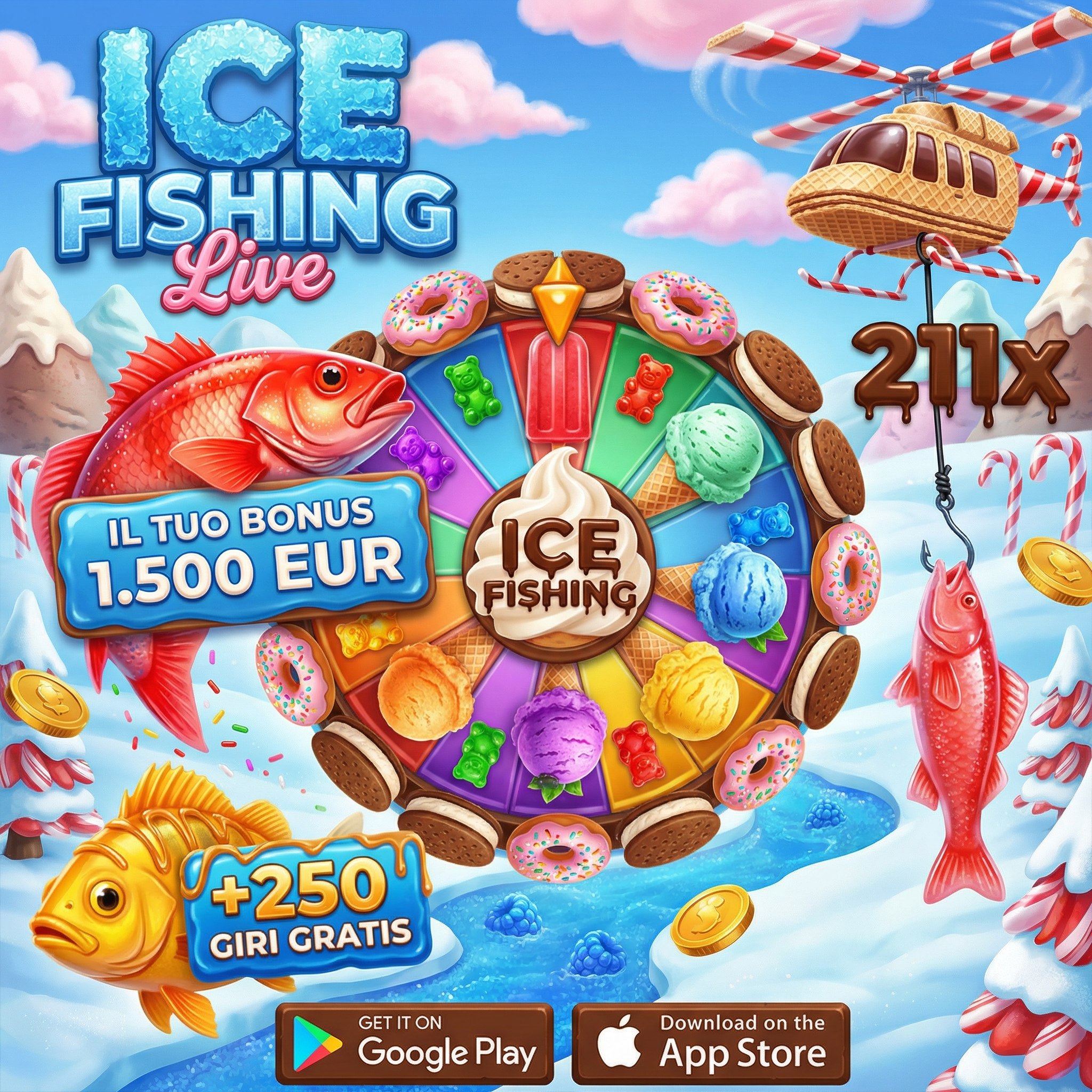 Рекламное изображение мобильной игры Ice Fishing Live с зимней тематикой. В центре композиции находится красочное колесо рулетки, окруженное различными сладостями - мороженым, пончиками, печеньем, мармеладными мишками. На фоне зимний пейзаж с горами и облаками. Справа летит вертолет с красно-белыми