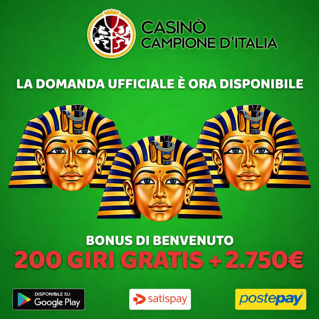 Статичное рекламное изображение итальянского казино на зеленом фоне с тремя изображениями египетских фараонов в золотых головных уборах. В верхней части логотип 'CASINO CAMPIONE D'ITALIA' с гербом. По центру крупная надпись о доступности официальной заявки. Внизу информация о бонусе и способах оплат