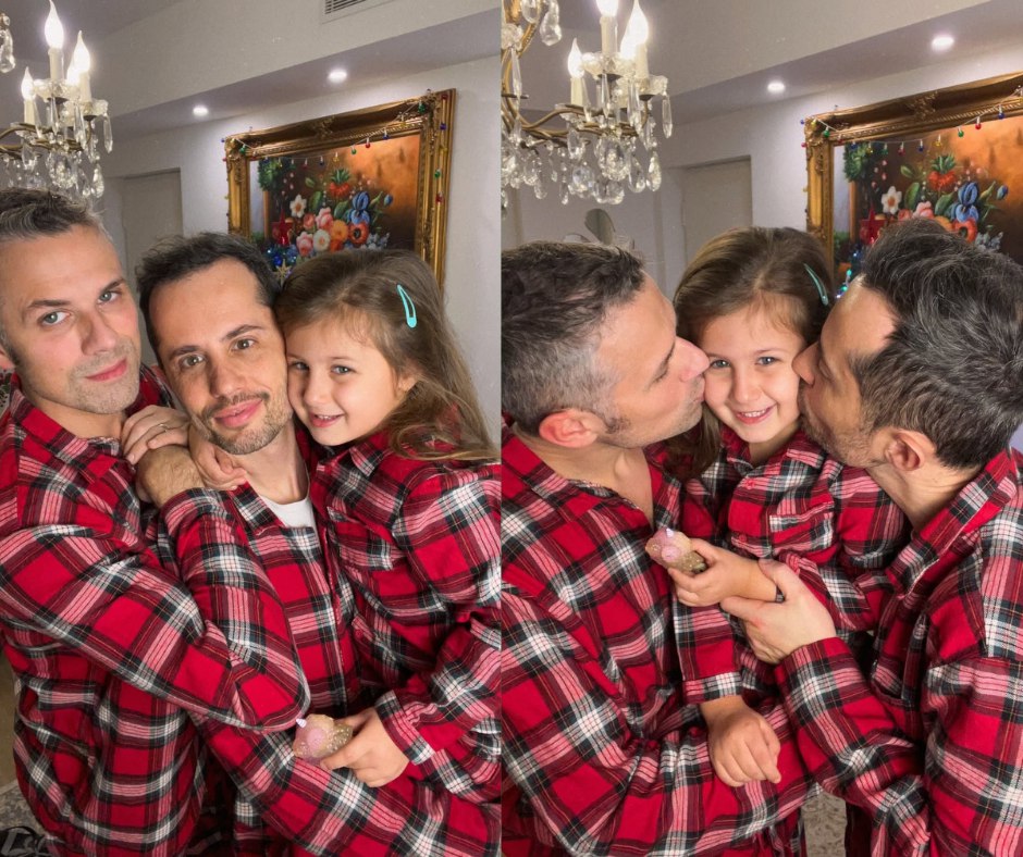 Семейные фотографии в одинаковых красно-чёрных клетчатых пижамах/рубашках. Слева: два мужчины и маленькая девочка обнимаются и улыбаются. Справа: те же люди целуют девочку по щекам. Фон - элегантный интерьер с люстрами и картинами в золотых рамах. Семейная, домашняя атмосфера праздника.