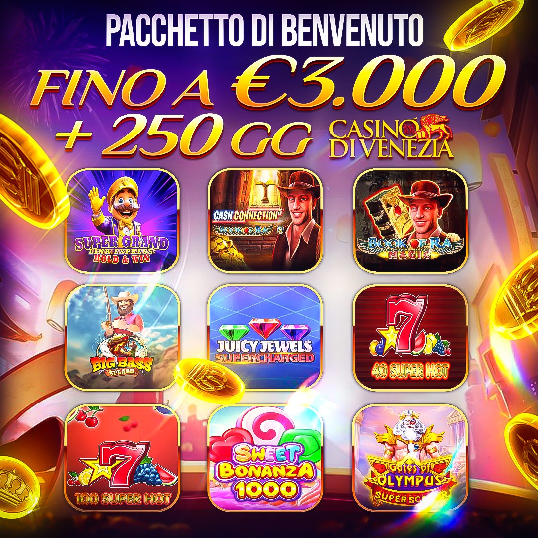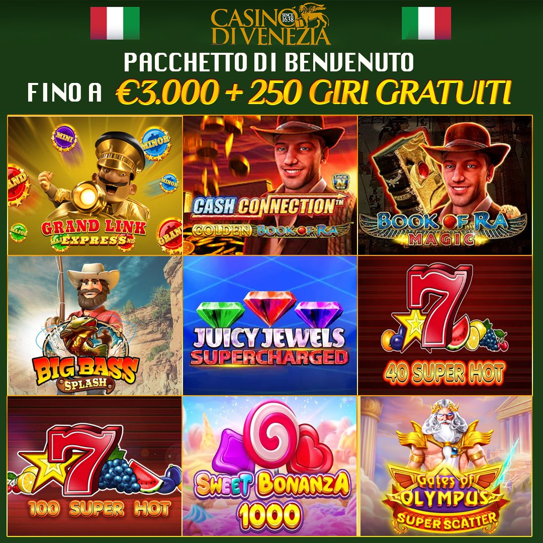 Статичное рекламное изображение Casino di Venezia с предложением приветственного пакета. Показана сетка из 9 различных слот-игр с яркой графикой и персонажами. Вверху размещены итальянские флаги и логотип казино с годом основания 1638.