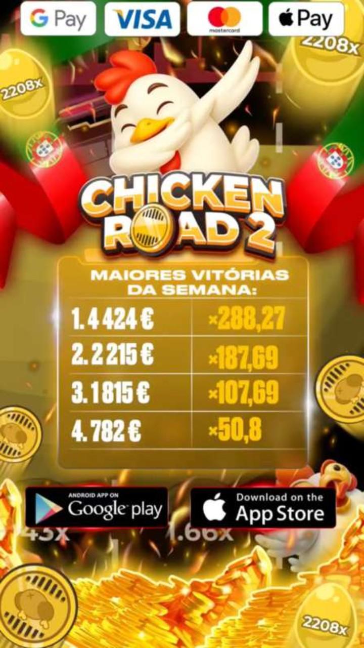 Рекламное изображение мобильной игры Chicken Road 2 с мультяшным персонажем-цыпленком в центре, показывающим жест дабинг. Вокруг персонажа золотые монеты с множителями (2208x), португальские флаги, и таблица с крупнейшими выигрышами недели