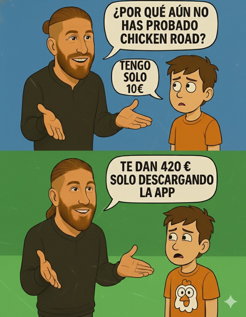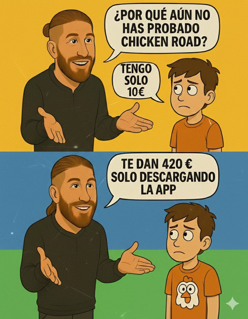 Двухпанельный комикс с мультяшными персонажами. В верхней панели бородатый мужчина спрашивает мальчика на испанском языке, почему он еще не пробовал Chicken Road, а мальчик отвечает, что у него только 10€. В нижней панели тот же мужчина говорит, что дают 420€ только за скачивание приложения. На футб