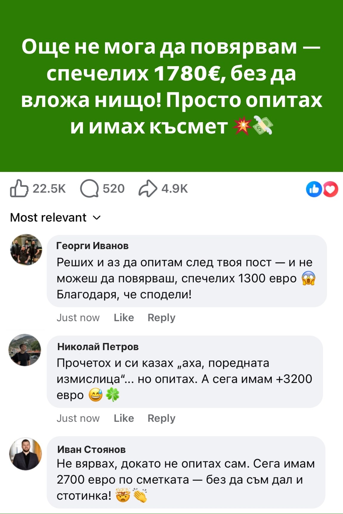 Социальный медиа пост в формате Facebook с зеленым фоном и белым текстом, рассказывающий историю о том, как человек не мог поверить в выигрыш 1780 евро без инвестиций. В комментариях несколько пользователей делятся своим опытом с похожими суммами выигрышей.