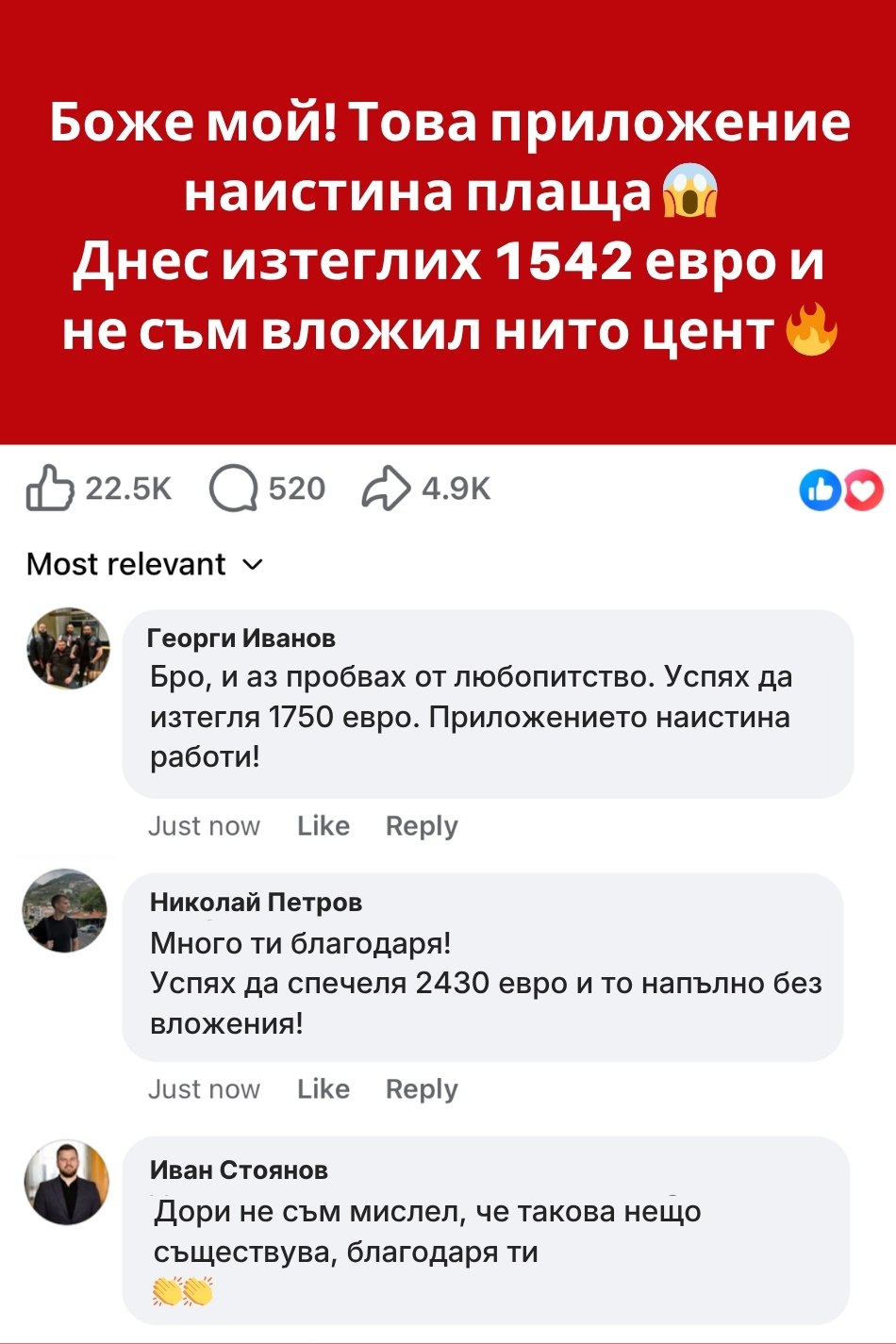 Статический пост в социальной сети с красным фоном, содержащий текст о выигрыше в приложении и комментарии пользователей. Основной текст сообщает о выигрыше 1542 евро без вложений, комментарии содержат благодарности с суммами 1750, 2430 евро.