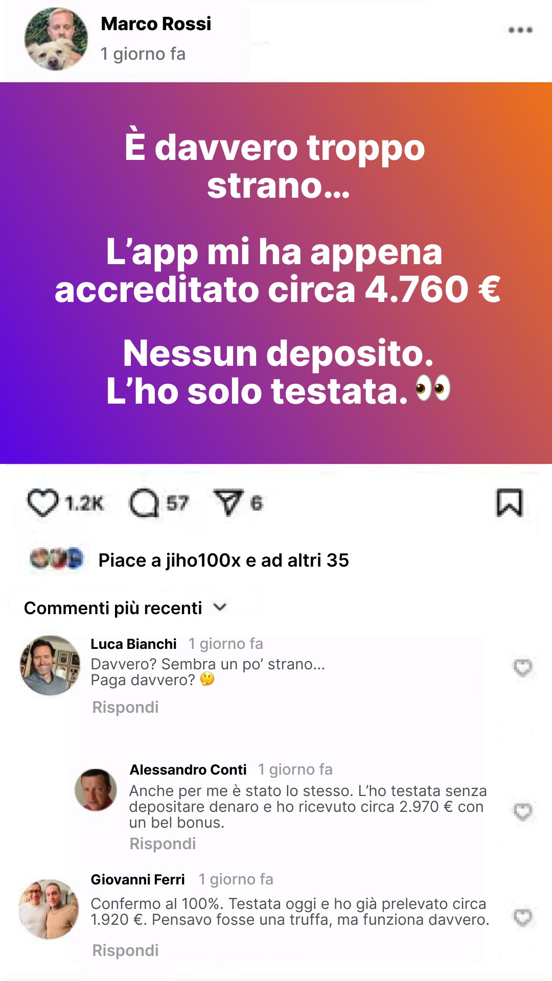 Социальный пост в Instagram от пользователя Marco Rossi с градиентным фоном (фиолетовый-оранжевый). Пользователь делится опытом тестирования приложения и сообщает о получении около 4760 евро без депозита. В комментариях другие пользователи подтверждают подобный опыт с выигрышами от 1920 до 2970 евро