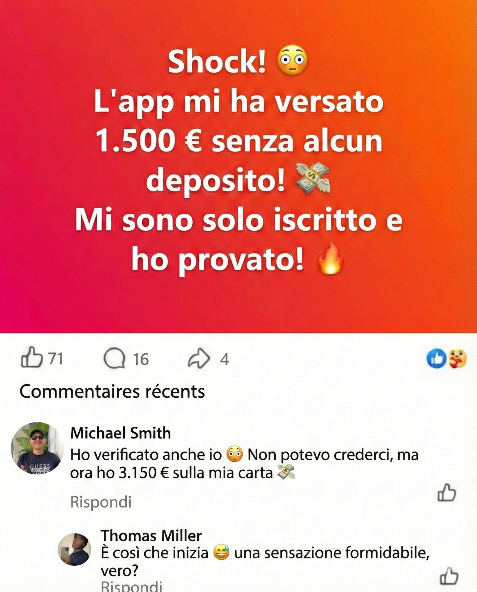 Статическое изображение - пост в социальных сетях с текстом о том, что пользователь получил 1500 евро от приложения без депозита. Пост написан на итальянском языке с эмодзи. Внизу показаны комментарии от других пользователей, подтверждающих получение денег.