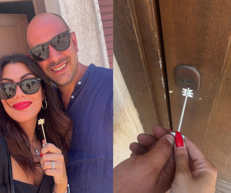 Составное изображение из двух частей: слева - селфи пары в солнечных очках на фоне кирпичной стены, оба улыбаются и держат ключи от двери/дома; справа - крупный план рук с красным маникюром, держащих ключ возле замочной скважины деревянной двери. Креатив показывает историю 'до и после' - получение к
