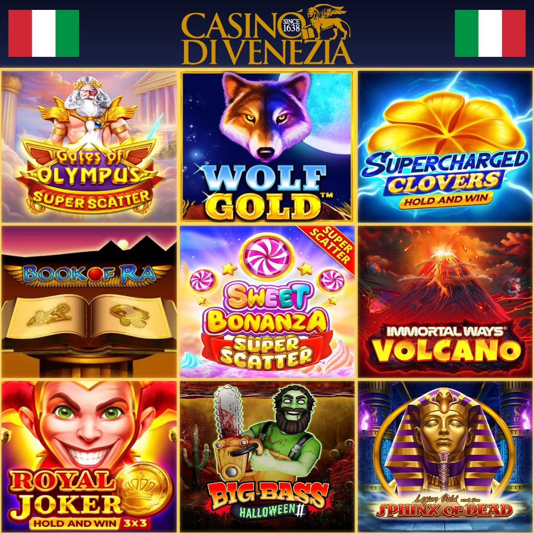 Статическое изображение - сетка из 9 игровых слотов казино di Venezia. Показаны превью различных слот-игр с яркими обложками и логотипами. В верхней части размещен логотип Casino di Venezia с датой основания 1638 и изображением крылатого льва. По краям изображения расположены флаги Италии.