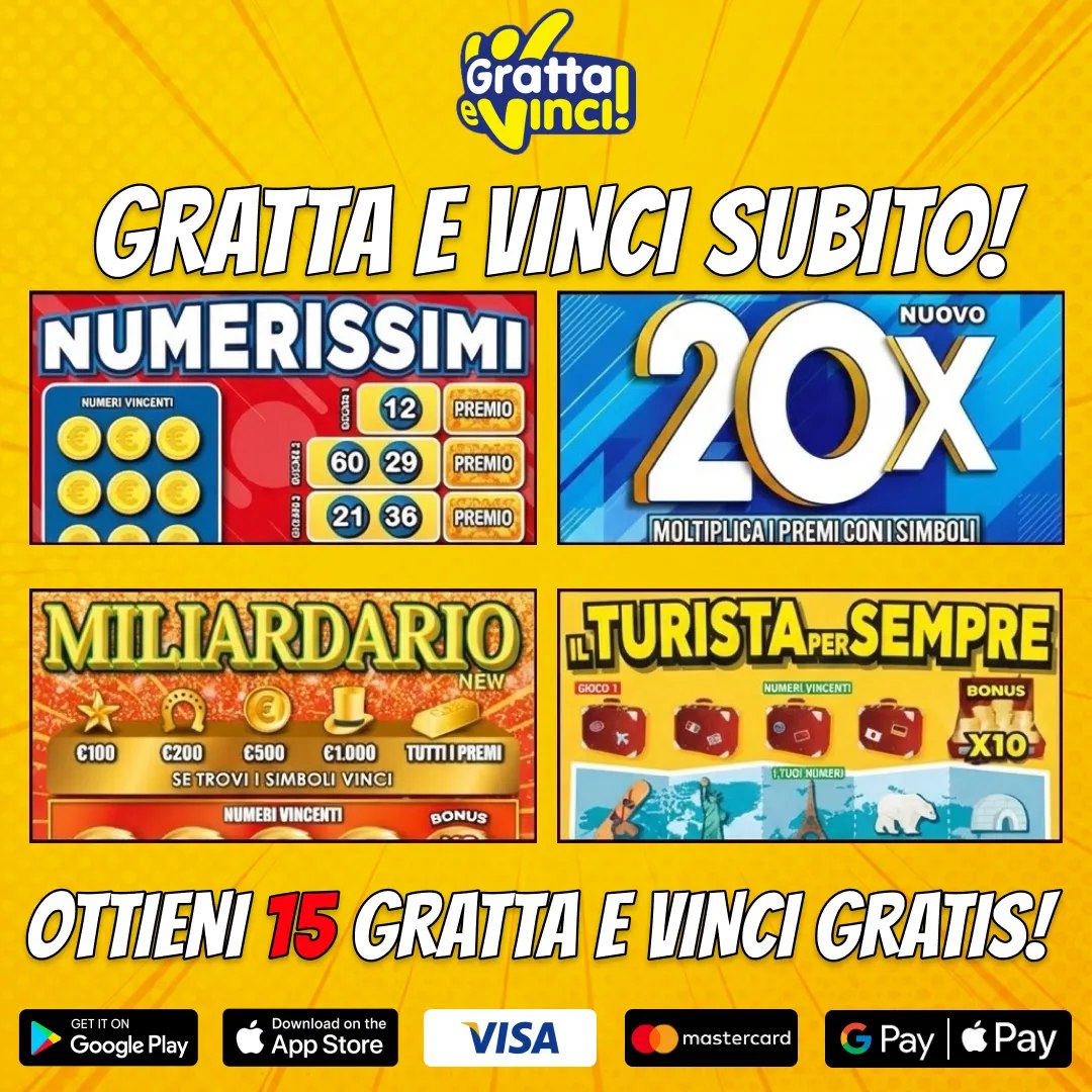 Offer: 15 бесплатных лотерейных билетов Gratta e Vinci, мультипликатор 20X, призы от €100 до €1000, бонус x10