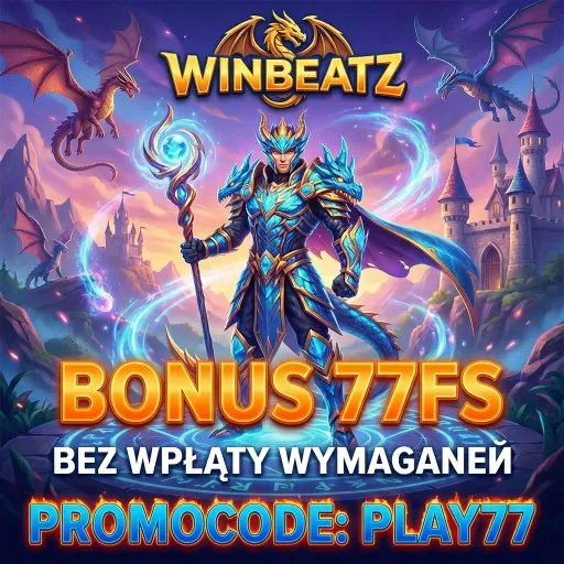 Рекламное изображение игры WinBeatz с фантазийным героем-воином в синих доспехах, держащим магический посох. На заднем фоне летают драконы и виден замок. Центральное внимание сосредоточено на промо-предложении с бонусными фриспинами.