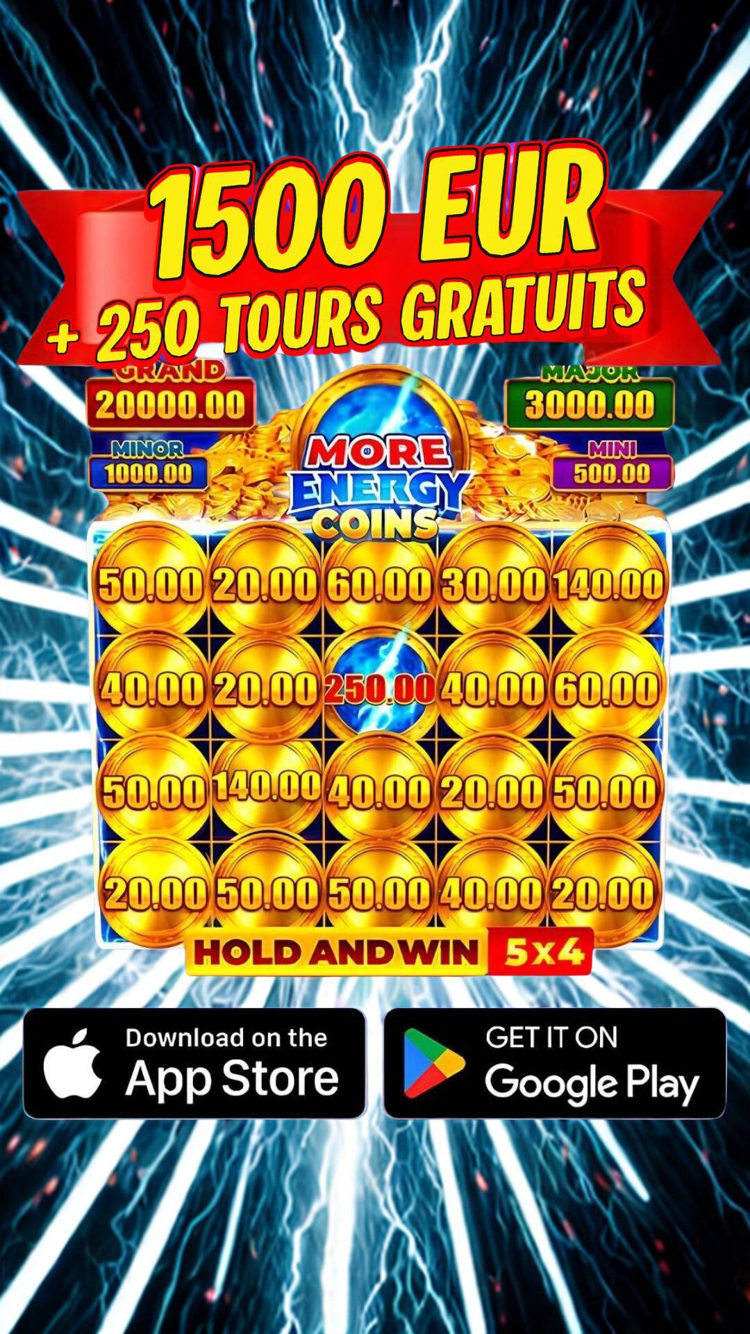 Рекламное изображение слота 'More Energy Coins' в формате 5x4 с золотыми монетами и энергетическим шаром в центре. Показана игровая сетка с различными суммами на монетах, в углах экрана отображены джекпоты (GRAND 20000.00, MAJOR 3000.00, MINOR 1000.00, MINI 500.00). Вверху красный баннер с предложен